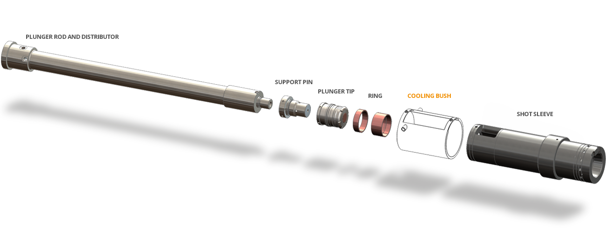 Copromec projected a special cooling bush. The cooling bush is very easy to fit: it has to be assembled on the front part of the shot sleeve and fixed with a locking screw. Then it is necessary to connect the water inlet and outlet circuits. Usually the cooling bush can be fitted also after assembling the plunger-rod unit. Thanks to its ease of disassembly, the cooling bush can be used on several shot sleeves with the same diameter.
